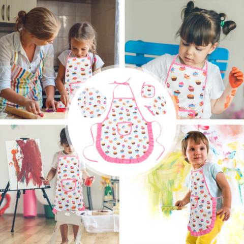 O avental possui fitas para amarrar no pescoço e na cintura, garantindo uso confortável para várias idades.